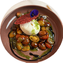 Buratta, méli melo de tomates cerises et basilic et sa réduction de balsamique au miel.