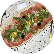 Carpaccio a l'italienne, fines tranches de bœuf cru, assaisonnées d'huile d'olive, citron, Parmesan et roquette.