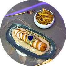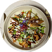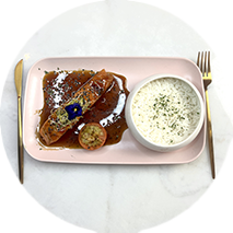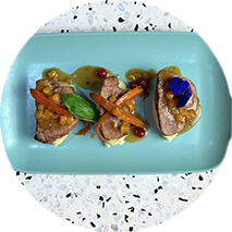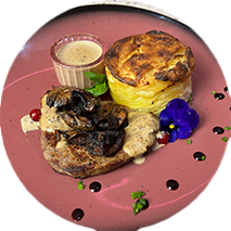 Rôtie au thym accompagné d’un écraser de pommes de terre et carotte caramélisée sauce abricot confit.